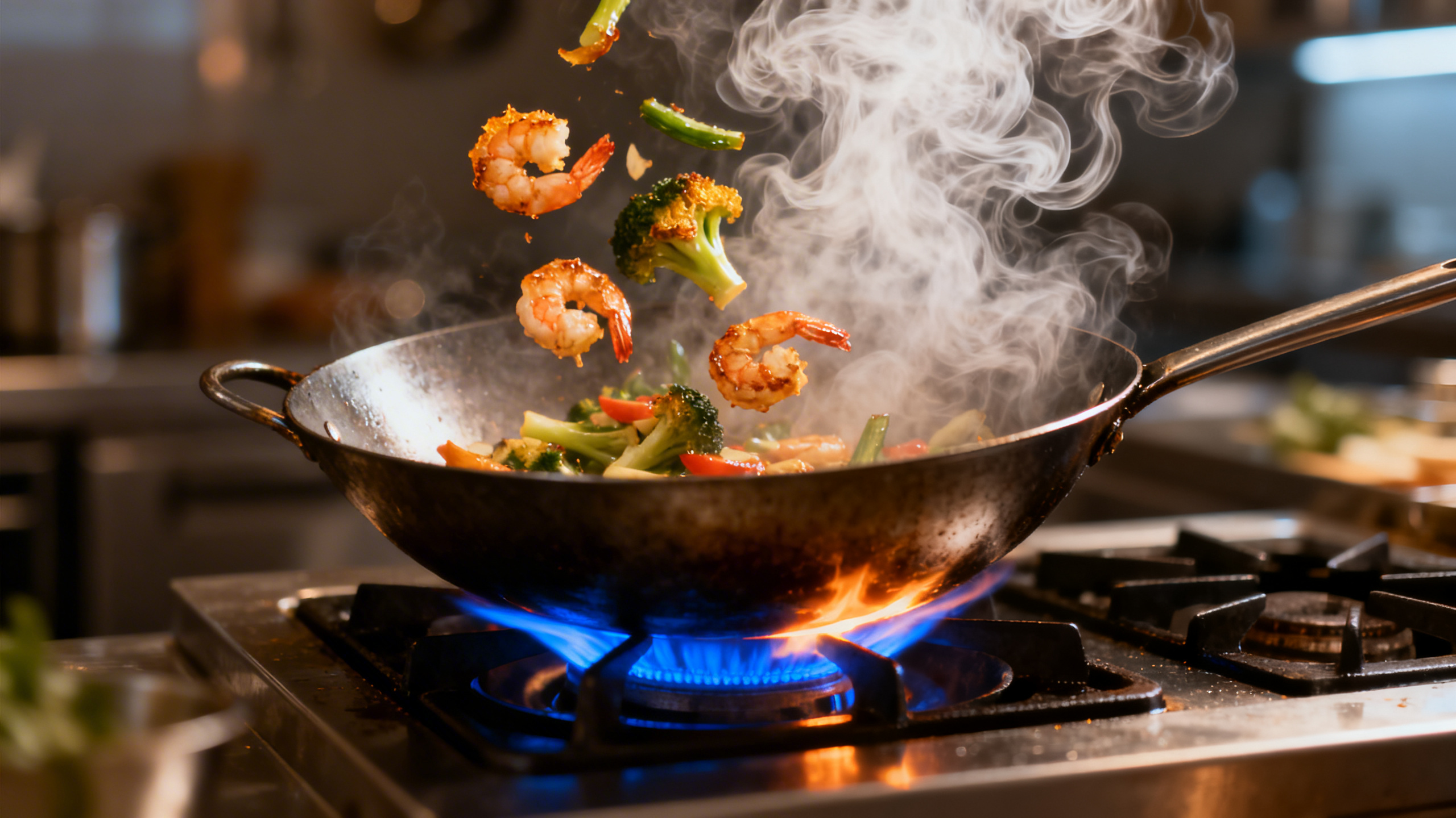 Avant même de penser aux ingrédients, le wok doit être chaud. Vraiment chaud. On parle de 250 à 300 °C, ce qui signifie, sur un feu de gaz domestique, trois à cinq minutes à pleine puissance sans rien dedans. Quand une fine fumée se dégage de la surface, c’est bon.